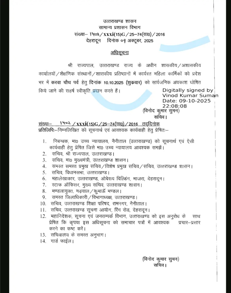 देहरादून| शुक्रवार को उत्तराखंड सरकार ने करवाचौथ के उपलक्ष्य में महिलाओं को सार्वजनिक अवकाश की सौगात दी है. सचिव विनोद कुमार सुमन की ओर से जारी आदेश के मुताबिक, शुक्रवार को करवाचौथ पर प्रदेश के सभी शासकीय, अशासकीय कार्यालयों, शिक्षण संस्थानों, शासकीय प्रतिष्ठानों में महिला कर्मियों के लिए सार्वजनिक अवकाश होगा.